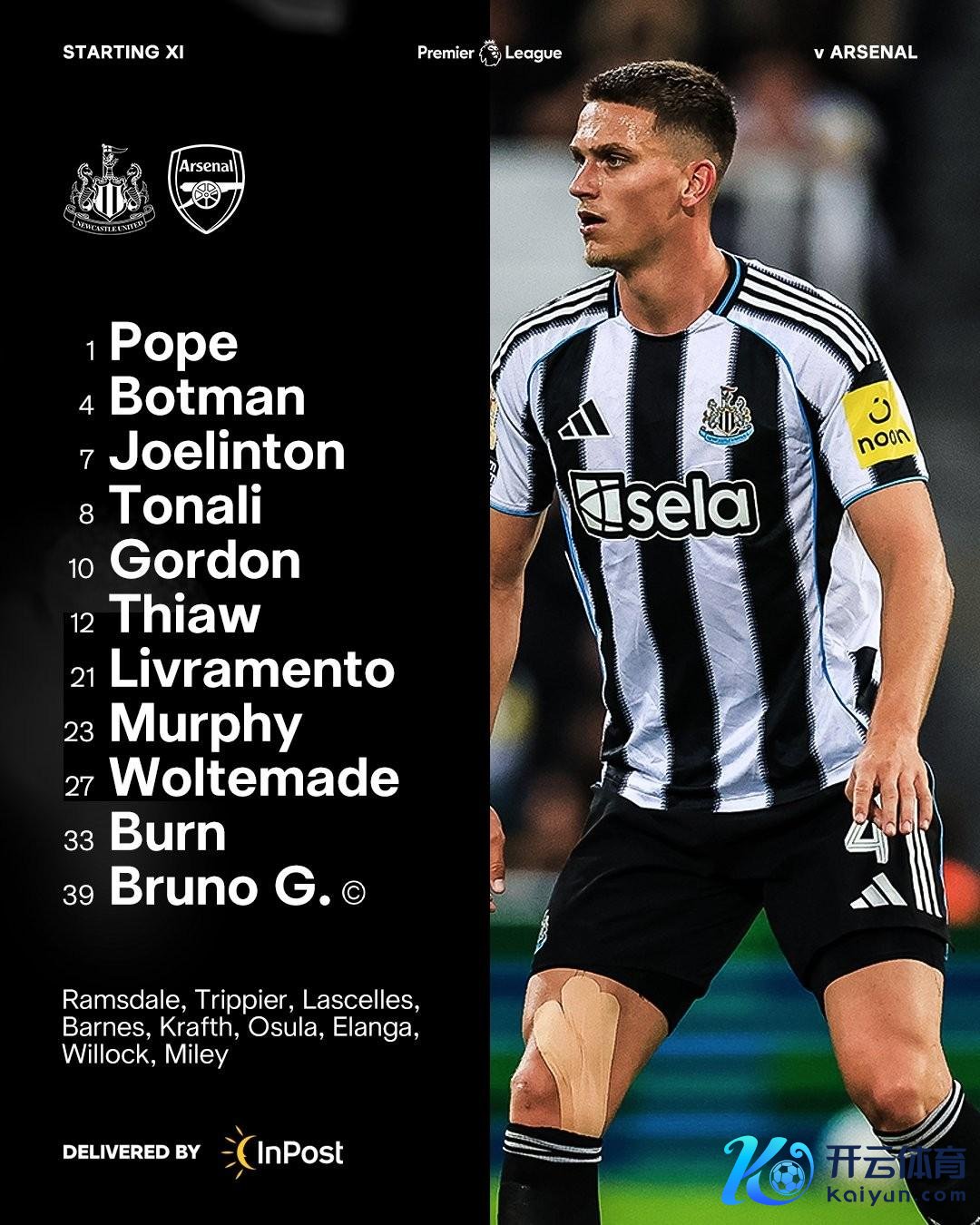 纽卡斯尔联首发:1-波普、33-丹-伯恩、4-博特曼、12-马利克-佳夫、21-利夫拉门托、8-托纳利、39-吉马良斯、7-乔林顿、10-安东尼-戈登、23-雅各布-墨菲、27-