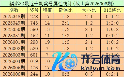 开奖回归:第2026006期福彩3D奖号为244。奖号格式为组三,大小比为0:3,和值为10,奇偶比为0:3,012路比为0:2:1,跨度为2。