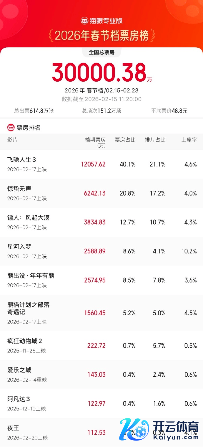 2月15日体育集锦,据猫眼专科版数据,2026年春节档档期总票房破3亿,《飞奔东说念主生3》《惊蛰无声》《镖东说念主:风起大漠》分列2026年春节档票房榜前三。