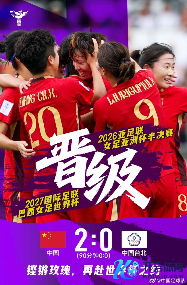 2026亚足联女足亚洲杯1/4决赛中,中国队2比0降服中国台北队,晋级本届亚洲杯四强,同期得回2027年巴西女足寰球杯参赛经历。