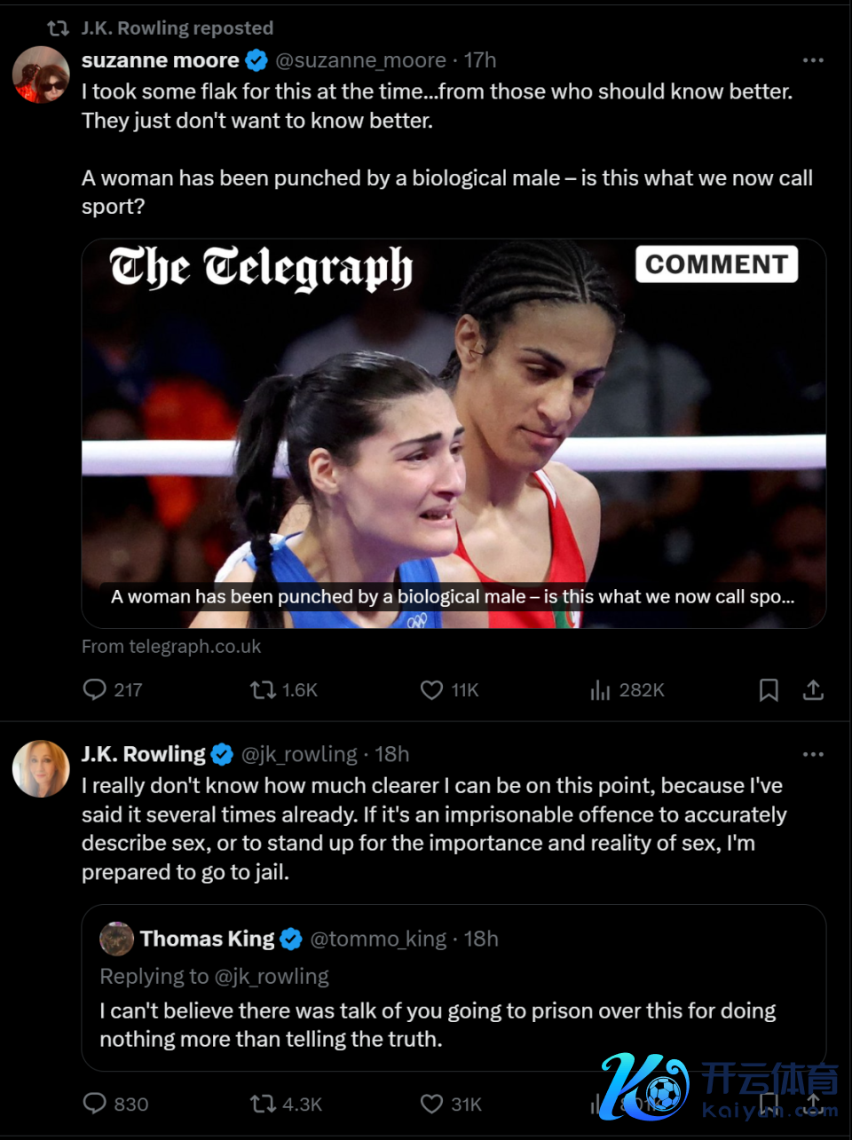 JK罗琳就公开默示,卡利夫的金牌应该被取消,并交换给着实的女性中国选手杨柳。马斯克和英国名嘴皮尔斯·摩根等在内的多位名东谈主纷纷对此本体进行转发挑剔,认贼为子地默示了对JK罗琳的支撑。但就当今的情况来看,卡利夫金牌被取消简直是不可能的。