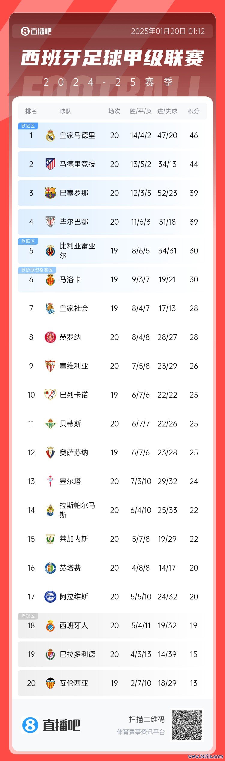 01月20日讯 西甲第20轮体育集锦,皇马主场4-1校服拉斯帕尔马斯,登顶西甲积分榜。马竞本轮0-1负于莱加内斯,巴萨1-1战平赫塔费,分辨过时皇马2分、7分。完满西甲积分榜情况如图。