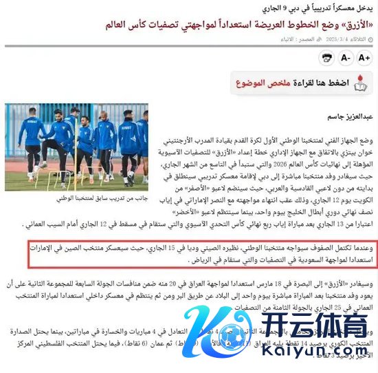 据科威特媒体3月4日的报谈称,科威特国度队主评释、阿根廷东谈主皮济一经与科威特足协就国度队的备战洽商完了了一致。把柄这份洽商,科威特国度队定于3月9日再行聚集,立时奔赴迪拜备战。不外,遵守于卡迪西亚队和阿拉比队的球员将暂时先不会随国度队一皆奔赴迪拜,因为两家俱乐部鉴识有各自的赛事任务。其中,卡迪西亚队将参预由海湾足联专揽的海湾俱乐部锦标赛半决赛,敌手是阿联酋的纳斯尔队,国脚将在3月12日赶赴迪拜与国度队会合;而阿拉比队则将参预定于3月12日进行的亚足联第三级别俱乐部赛事挑战杯的1/4决赛第二回合角逐,敌手是阿曼的锡布队,国脚们定于3月13日赶到迪拜和国度队会合。