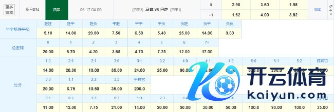 竞彩官方给本场西甲榜首大战开出2.90(马竞胜)、3.60(平局)、1.98(巴萨胜)胜平负组合,关于西甲领头羊巴萨赐与本年以来17场不败出色的情景题材数据守旧。比分竞猜玩法方面,两边1-1战平比分赔率最低为1赔6.75,巴萨客场2-1赢球为1赔7.75紧随自后,马竞主场2-1赢球为1赔10.00,两边2-2战平为1赔10.50,巴萨客场1-0和2-0取胜离别为1赔11.00和12.00,举座来看关于巴萨略有上风倾向。