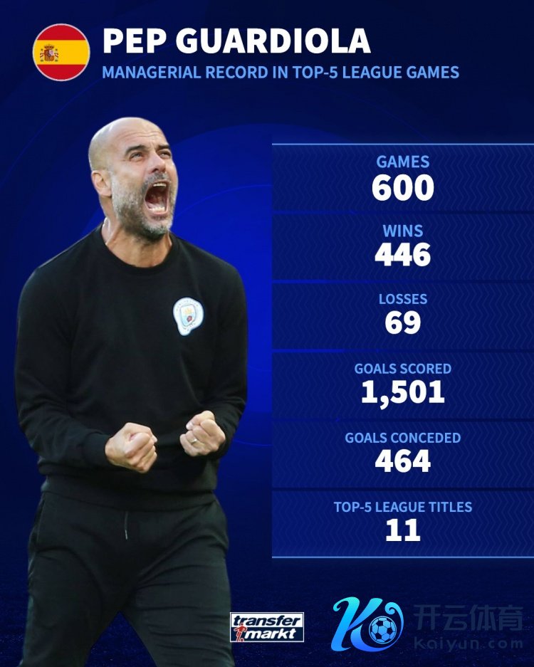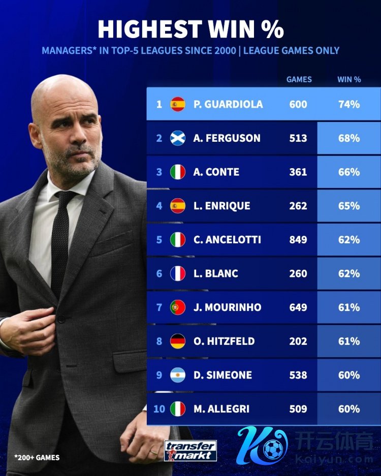 9月15日讯 德国转会市集统计了本世纪五大联赛莳植的联赛胜率,比肩出榜单,瓜迪奥拉持教600场,取胜446场,胜率74%居首。