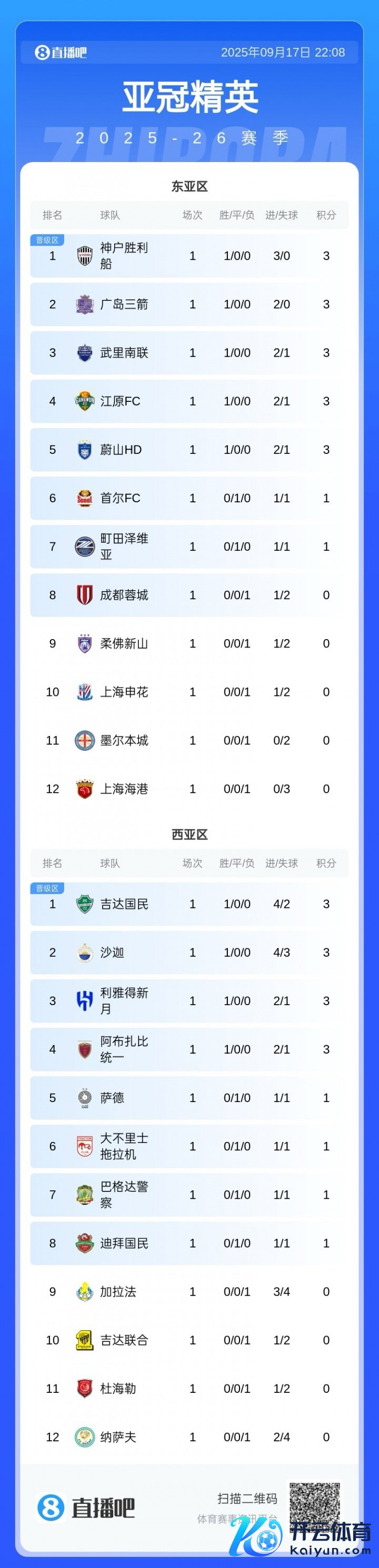 09月17日讯 亚冠精英东亚区第一轮的比赛已一齐戒指,最新积分榜出炉。