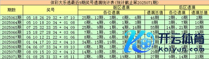 上期追思:体彩大乐透第2025071期开出奖号为:01 08 25 31 33 + 05 11,其中前区诸位奖号永别遗漏:2期、0期、5期、19期和1期,遗漏总值为27期,后区号码永别遗漏9期和14期体育赛事直播,遗漏总值为23期。