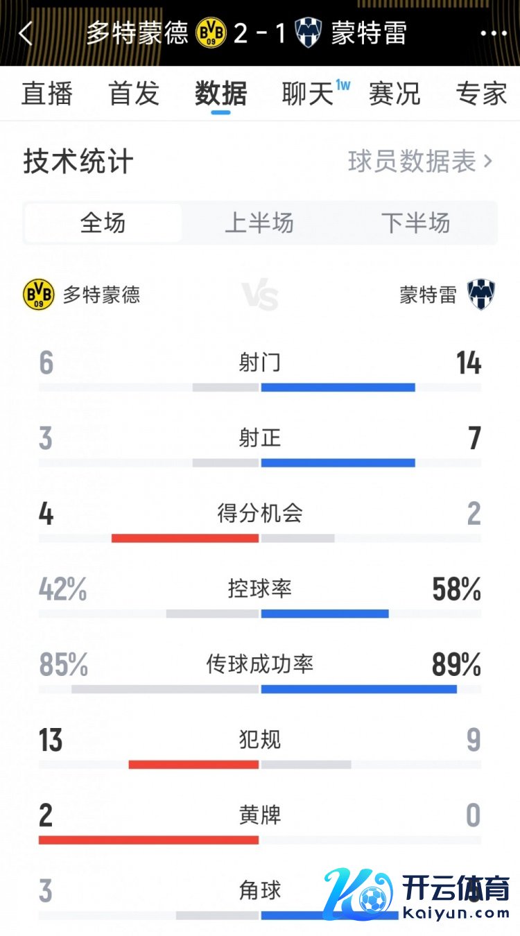 本场数据,多特数据全面遭敌手压制,射门数、射正数、控球率均不如蒙特雷,不外最终赢下比赛。
