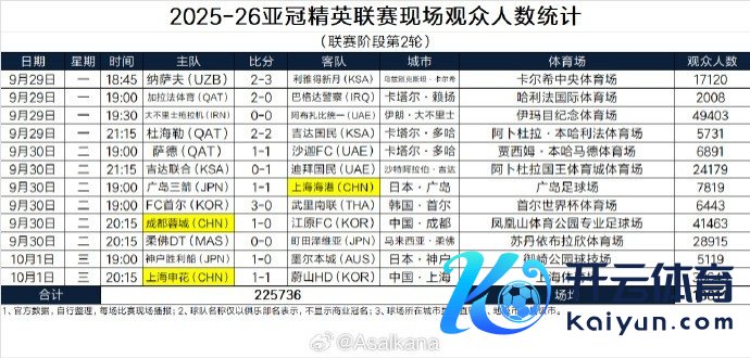2025-26亚冠精英联赛现场不雅世东谈主数统计(联赛阶段第2轮) 体育赛事直播