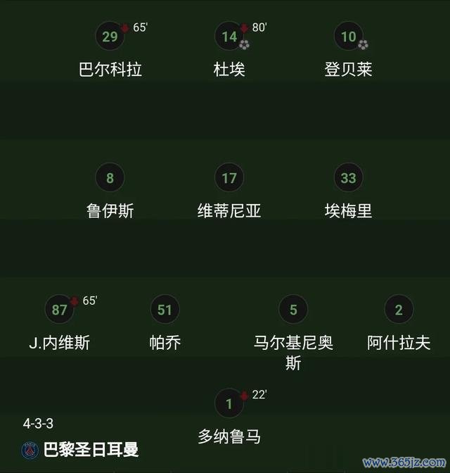 巴黎圣日耳曼排出了4-3-3的阵型,登贝莱,杜埃,巴尔科拉顶在前列,埃梅里,维蒂尼亚,鲁伊斯埋伏死后,阿什拉夫,马尔基尼奥斯,帕乔,内维斯构成四后卫。门将依旧是多纳鲁马!
