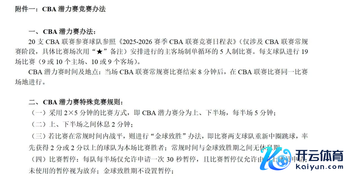 中国篮协的一纸公告让整个篮球圈炸开锅!2025-26赛季CBA联赛将迎来史上最颠覆性改造:通例赛每节时刻从12分钟裁减至10分钟,更震憾的是新增设“第五节”——专属替补球员的“CBA后劲赛”。这项独创寰宇先河的赛制,将在通例时刻末端8分钟后开打,分为险峻半场各5分钟,战平则启动“金球致胜”规定,眨眼间决定输赢。