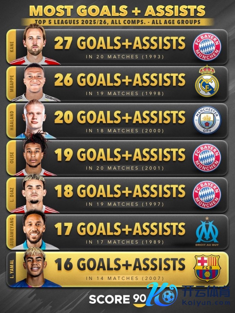 本赛季五大联赛球员参与进球榜(整个赛事):凯恩(拜仁)——20场27球姆巴佩(皇马)——19场26球哈兰德(曼城)——18场20球奥利塞(拜仁)——20场19球迪亚斯(拜仁)——19场18球奥巴梅扬(马赛)——17场17球亚马尔(巴萨)——14场16球 体育赛事直播