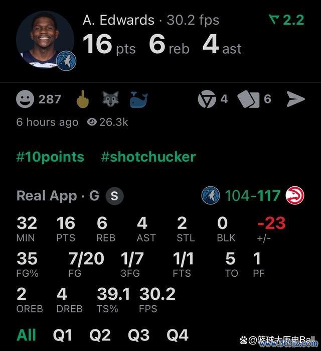 拿对阵老鹰的比赛来说,爱德华兹施展失常,全场20中7,三分7中1,罚球1中1,只得回16分6篮板4助攻,还出现了5次造作,正负值-23,全队最低。
