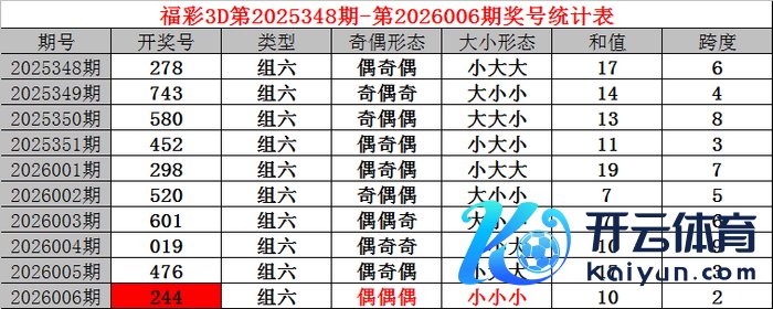 上期回归:福利彩票3D第2026006期开奖遵守244。奖号:偶偶偶、小小小,和值10,跨度2。