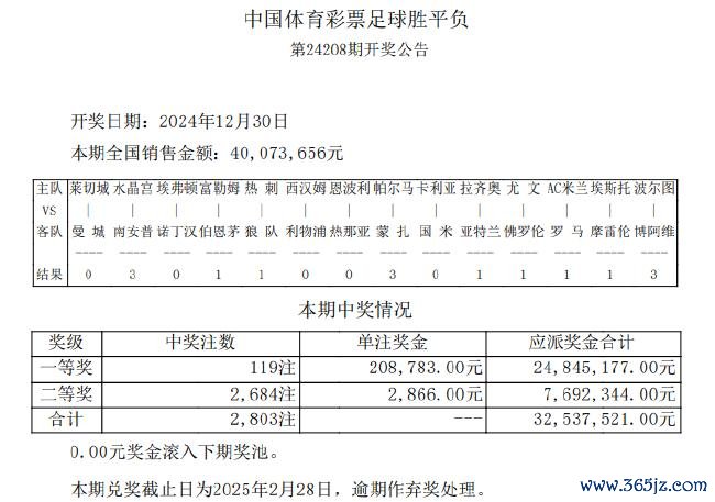北京技艺12月30日体育赛事直播,赢输彩第24208期开奖效劳揭晓。本期足彩开出119注头奖,单注奖金20.8万,二等奖开2684注2866元,6,892,285.44元滚存一起清空;任九开出23643注704元。本期赢输彩销量为40,073,656元,任九投注总数为26,031,356元。