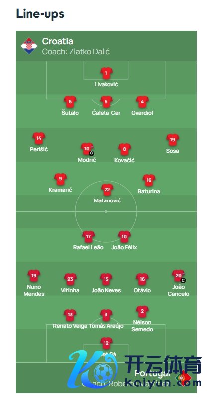 葡萄牙首发:12-若泽-萨、2-塞梅多、3-托马斯-阿劳霍、13-雷纳托-维加、20-坎塞洛、16-奥塔维奥、15-若昂-内维斯、23-维蒂尼亚、19-努诺-门德斯、10-菲利克斯、17-莱奥