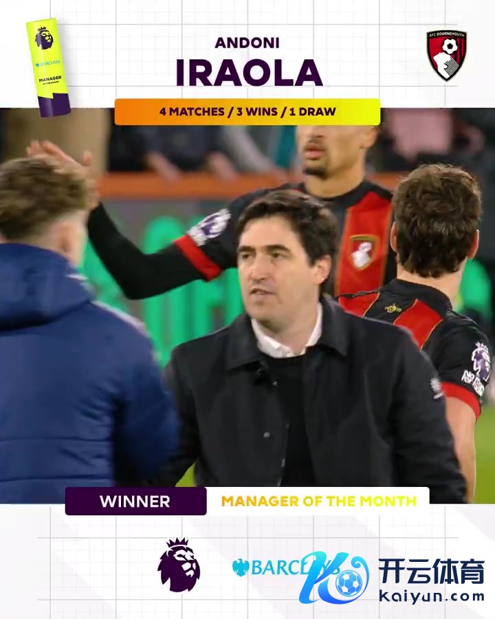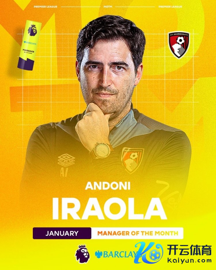 2月7日讯 英超官方秘书,伯恩茅斯主帅安多尼-伊劳拉当选英超1月最好诠释。