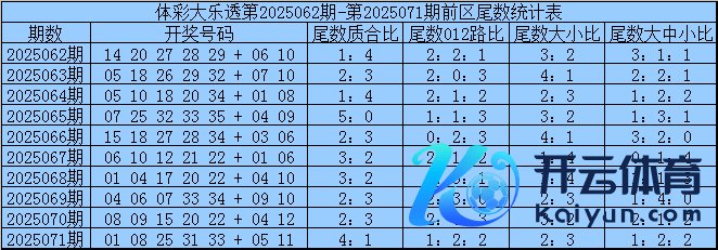 体彩大乐透第2025071期开奖号码为:01 08 25 31 33 + 05 11其中前区奖号奇偶比为4:1,大小比为3:2,012路为1:3:1,前区余数质合比为4:1,012路比为1:2:2,大小比为2:3,大中小比1:2:2。