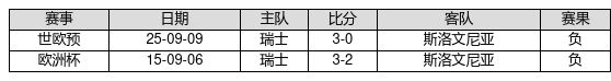 斯洛文尼亚 VS 瑞士两队近10年的交战次数为2场,斯洛文尼亚0胜0平2负,赢球概率为0.0%,平局概率为0.0%,输球概率为100.0%。