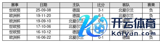 北爱尔兰 VS 德国两队近10年的交战次数为6场,北爱尔兰0胜0平6负,赢球概率为0.0%,平局概率为0.0%,输球概率为100.0%。