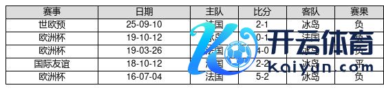 冰岛 VS 法国两队近10年的交战次数为5场,冰岛0胜1平4负,赢球概率为0.0%,平局概率为20.0%,输球概率为80.0%。