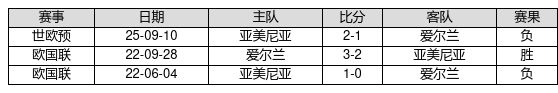 爱尔兰 VS 亚好意思尼亚两队近10年的交战次数为3场,爱尔兰1胜0平2负,赢球概率为33.3%,平局概率为0.0%,输球概率为66.7%。