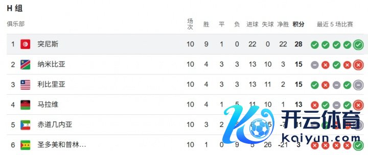 10月13日讯 世初赛非洲区小组赛H组今天闭幕了终末一轮的一起较量,最终突尼斯以10轮28分,进22球失0球的无解战绩小组第一收官。