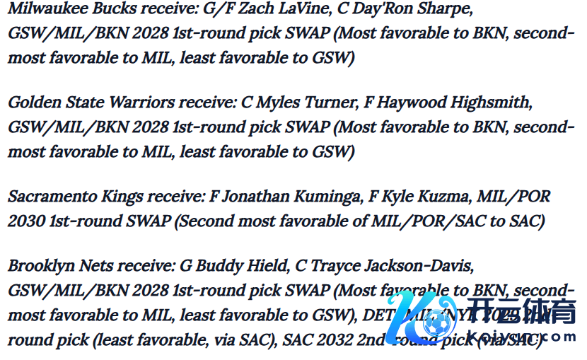 在这次往复中,波及四支球队,8名球员。其中,密尔沃基雄鹿收成扎克·拉文、戴朗·夏普的同期,外加2028年首轮交换权;金州硬汉则揽入中锋迈尔斯·特纳与先锋海伍德·海史姑娘,外加2028年首轮选秀权交换;萨克拉门托国王队得到先锋乔纳森·库明加和先锋凯尔·库兹马,并享有2030年首轮选秀权交换的履历;布鲁克林篮网不仅得到巴迪·希尔德与中锋特雷斯·杰克逊 - 戴维斯,还得回2028年首轮选秀权交换的权益,以及国王2029年第二轮选秀权和国王2032年第二轮选秀权。