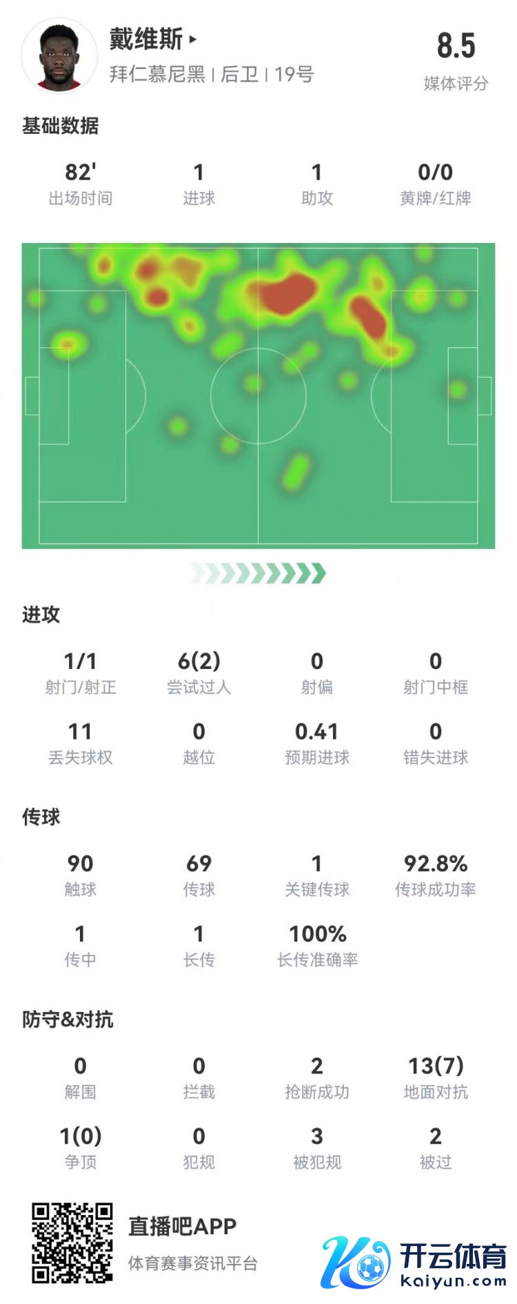 12月21日讯 拜仁在本轮德甲5-1跨越莱比锡,戴维斯本场数据如下:
