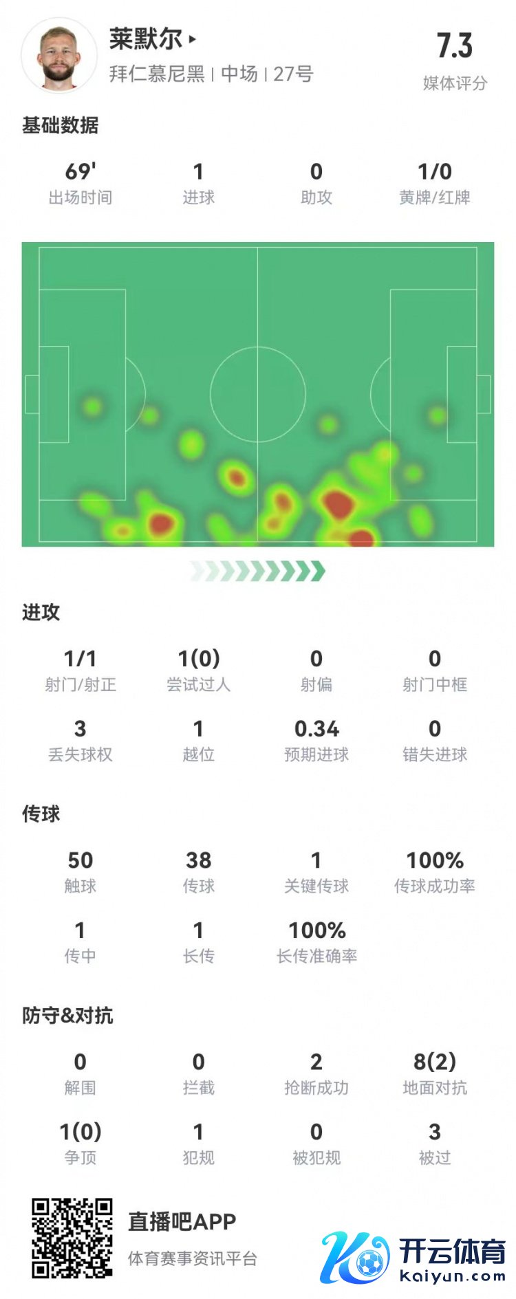 12月21日讯 拜仁在本轮德甲3-1领衔莱比锡,莱默尔本场数据如下: