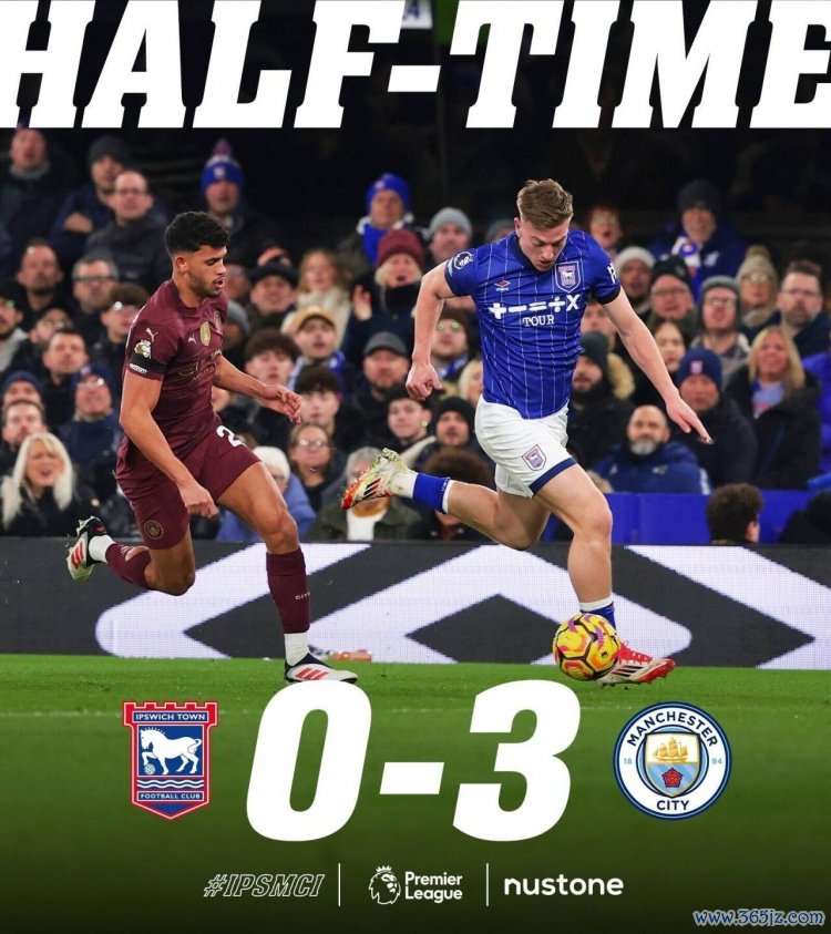 上半场伤停补时1分钟,半场收尾,曼城暂3-0伊普斯维奇。